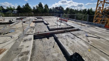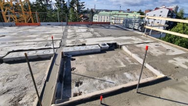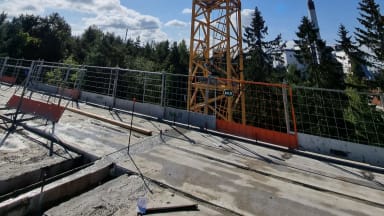Viikolla 36 TOAS Rauhaniemen työmaalla jatkettiin 7 kerroksen runkotöitä. Maanantaina asennettiin väliseinät ja massiivilaatat sekä nostettiin ikkunat, parvekeovet ja kipsilevyniput kerrokseen. Tiistaina asennettin 7 kerroksen holvin ontelolaatat ja keskiviikkona hormielementit sekä parvekelaatat. Keskiviikkona päästiin aloittamaan myös holvin tuke- ja raudoitustöitä, jotka tehtiin loppuun torstaina. Perjantaina oli puolestaan vuorossa 7. holvin saumavalu. Ensi viikolla päästäänkin asentamaan jo toiseksi viimeisen kerroksen eli 8 kerroksen elementtejä. Putkiurakoitsija jatkoi töitään edellisten viikkojen tapaan kylpyhuoneiden ja keittiöiden viemäreiden sekä rakennuksen lämpölinjojen parissa. Sähköurakoitsija teki 7 kerroksen holvin putkitukset ja kaapeloinnit valmiiksi ennen perjantain valua sekä jatkoi työmaasähköjen asentamista. IV-urakoitsijakin pääsi kuluneella viikolla vauhtiin ja sai 1 kerroksen melkein kokonaan jo kanavoitua. Perjantaina oli myös vuorossa 4 kerroksen ikkunoiden ja parvekeovien asennus. Alla taas hieman kuvia työmaalta: