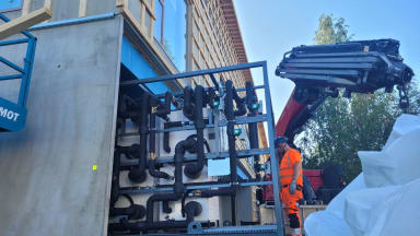 Maalämpöpaketti nostettiin paikoilleen julkisivuun jätetyn aukon kautta. Isoja komponentteja haalattaessa kiinnityksissä ja lujuuslaskelmissa tulee olla vielä normaaliakin huolellisempi