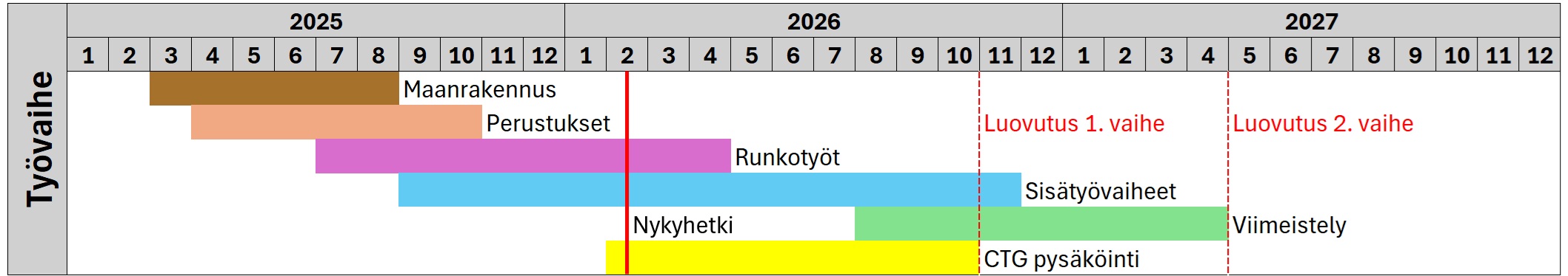 Työmaa etenee aikataulussa. Nykyhetki on kuvattu punaisella viivalla alla olevassa kuvassa.