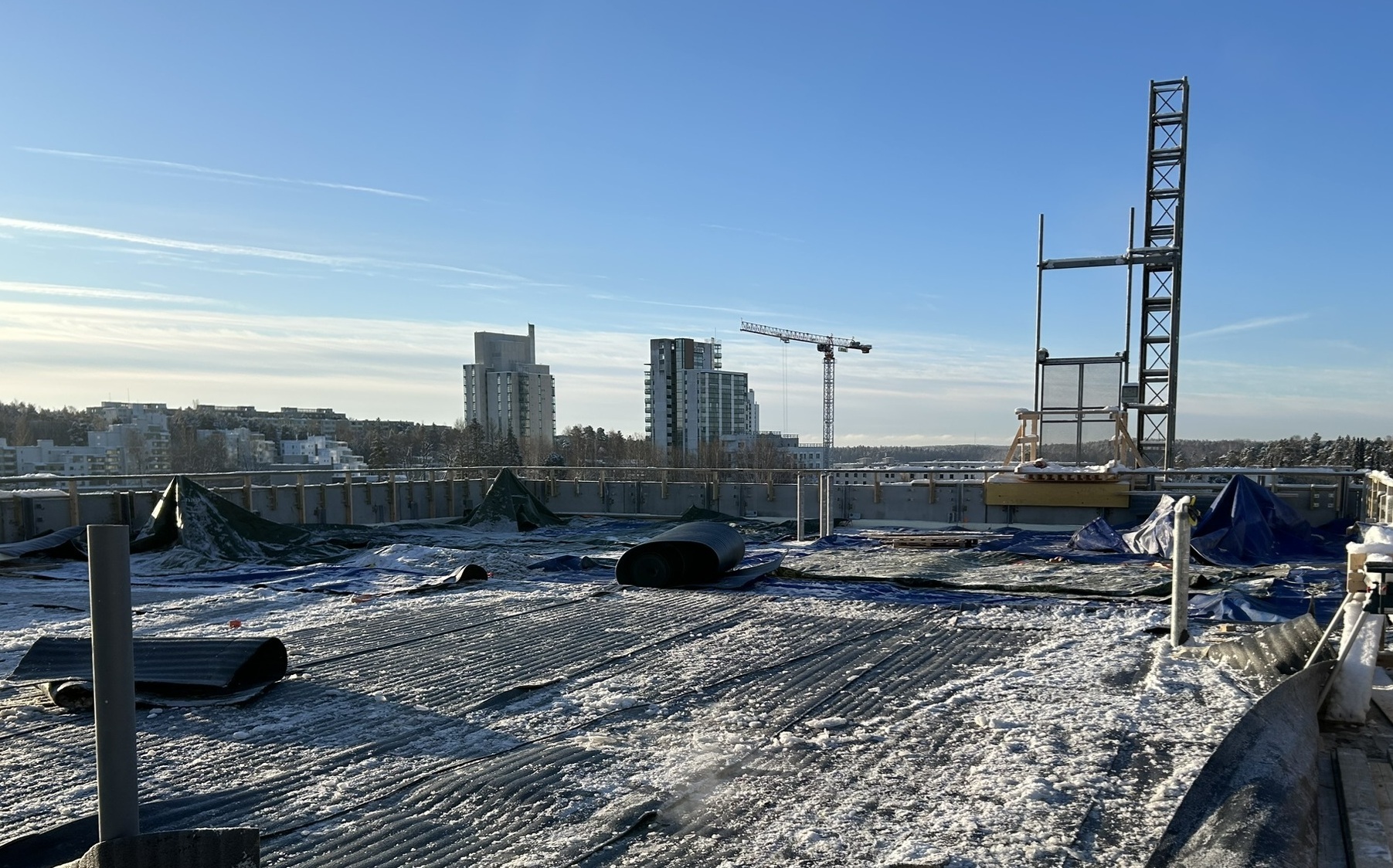 Vesikatolla katollavalutyöt loppusuoralla. Myös IVKH-teräsrunko asennukset käynnistyneet sekä höyrynsulkukermitys.