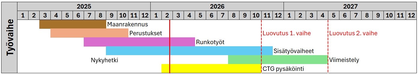 Työmaa etenee aikataulussa. Nykyhetki on kuvattu punaisella viivalla alla olevassa kuvassa.