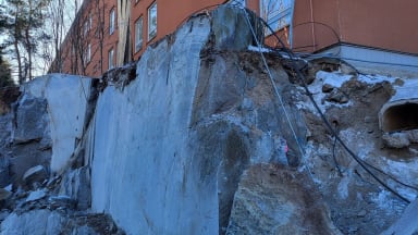Alla kuva kalliosahauksista Gunillanpuiston B-talon ja autohallin välissä