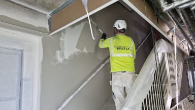 A-talon porrashuoneiden tehosteseinien maalaustyöt käynnissä.