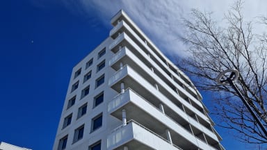 B-talon parvekkeilla on aloitettu kaidelasien asennukset.