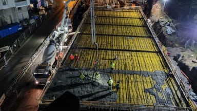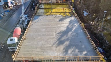 Jälkijännitetyn autohallin kannen valu käynnissä. Koko kansi valetaan kerralla, noin 260 kuutiota betonia.