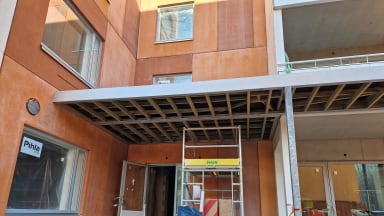 A- ja B-talon välisen arkadin alapinnan levytystyöt käynnissä.