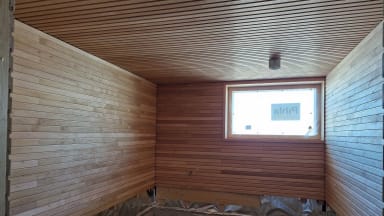 A-talon ylimpään kerrokseen tulee yleissauna. Saunaosaston panelointityöt ovat käynnissä.