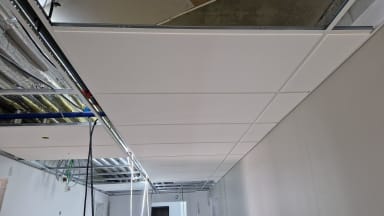 A-talon porrashuoneen akustisten alakattojen työt aloitettu.