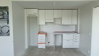B-talon asuntojen kalusteasennukset ovat loppusuoralla ja laminaattiasennus voi edetä myös ylempiin kerroksiin.