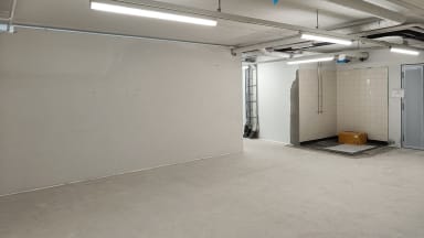 Talojen isoihin ulkoiluvälinevarastoihin tulee myös pesupaikat. Kuva on B-talosta, ja laatoitettu pesupaikka on näkyvissä oikeassa nurkassa.