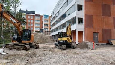 Pihan pinnantasaus on käynnissä, jotta pihatyöt voivat alkaa. Kuvassa A-talon länsipuolta.