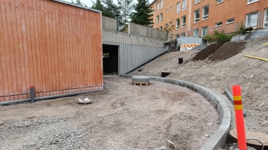 Autohallin sisäänajon työt etenevät ja reunakiveysten asennus on käynnissä.
