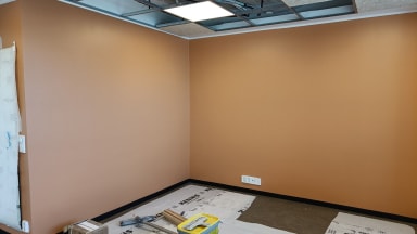 A-talon ylimmän kerroksen kerhohuoneen seinät ovat maalattu ja mattotyöt ovat valmiit.