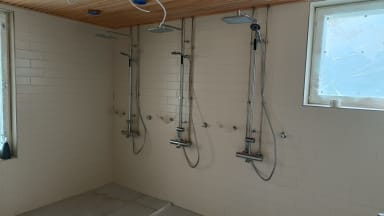 A-talon saunatilojen LVIS-työt ovat käynnissä, kuvassa pesuhuoneen sadesuihkut.