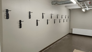 Ulkovälinevarastoissa pyörätelineiden asennus on käynnissä lattioiden maalauksen valmistuttua.