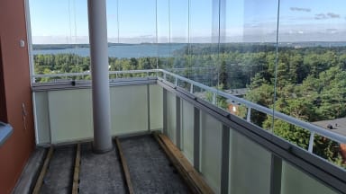 A-talon länsipuolen parvekkeilla on parvekeritiläasennus käynnissä.