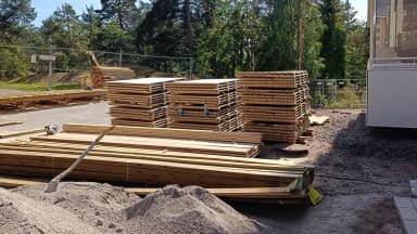 Parvekeritilät kasataan maan kamaralla ja nostetaan parvekkeille valmiina nippuina. Kuvassa on sekä valmiita ritilöitä että materiaalia.