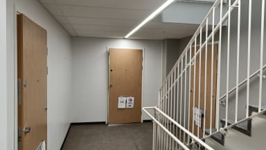 Myös B-talon käytävät alkavat näyttämään valmiimmilta, sillä porrashuoneen alakattolevytykset ovat käynnissä.