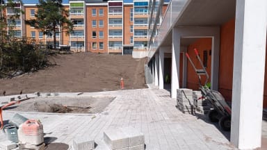 Pihakiveystyöt ovat käynnissä. Kuvassa on B-talon länsipuolen edistys.