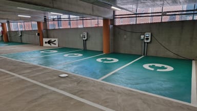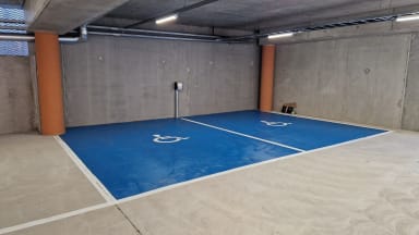 Autohallin pysäköintiruutujen maalaustyöt käynnissä. Autohalliin tulee peruspaikkojen lisäksi sähköauton latauspaikkoja sekä liikkumisesteisten paikkoja.
