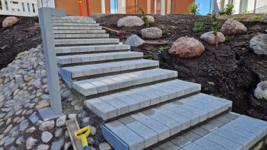 B-talon ja autohallin välissä olevien maastoportaiden asennustyöt käynnissä.