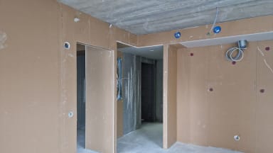 A-talossa on aloitettu kipsiväliseinien tuplaus ja alakattojen teko.