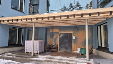 - Sisäänkäyntikatoksiin liittyvät puutyöt käynnissä: