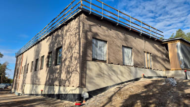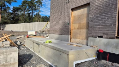 - Julkisivumuurauksia valmiina; lastauslaiturin seinustaa ja alempana C-osan alapihan kulma: