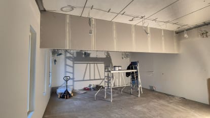 - A1:ssä opetustilaan tulevan siirtoseinän tukirakenne levyverhouksineen asennettuna kattoon.