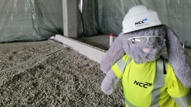 Työmaalla puhallettiin tänään vaahtolasia väestönsuojan yläpuolelle ja Kaninen Finen kävi seuraamassa työn edistymistä.