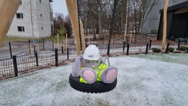 Kaninen Finen kävi kokeilemassa pihalle asennettuja keinuja.