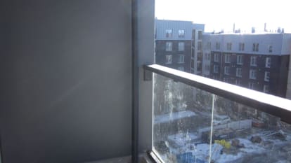 Pääkuvassa 8. kerroksen parvekekaide parvekkeelta. Kuvassa näkyy myös tontilla olevien taloyhtiöiden yhteistä piha-aluetta.
