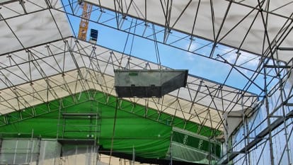 Rakennusten vesikatolla jatkuvat purkutyöt. Katon sääsuojassa on kaksi aukkoa, joista kattorakenteiden purkujätteet nostetaan nostojassikalla katolta pihalle asianmukaisiin jätelavoihin. Julkisivua puretaan A-talosta, ja myös sisäpihalla olevan pihakannen purkua päästään aloittamaan.
