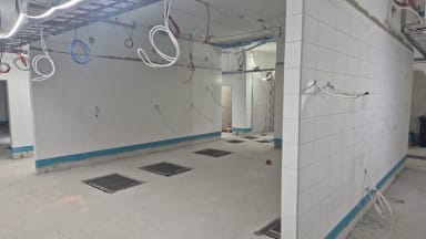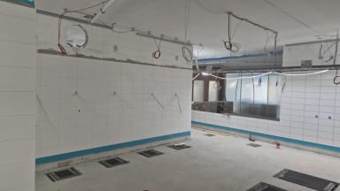 Kuvat: Laatoitustyöt käynnissä valmistuskeittiössä.