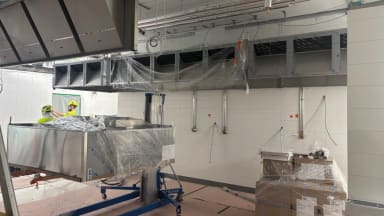 Kuva: Valmistuskeittiön huuvien asennus käynnissä.