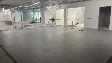 Kuva: Käytävän lattialaatoitus käynnissä C-lohkolla
