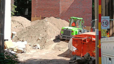 Ulkopuolella tehdään maanrakennustöitä ja ulkovarastoon on asennettu uusia ovia.