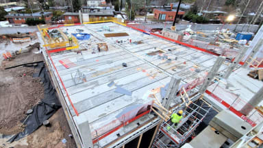 - C-lohkolla on käynnissä maanvaraisen laatan työt sekä julkisivutelineiden asennus.