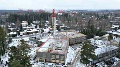 - B-lohkolla on alkanut puurakenteisen vesikaton asennus ja väliseinämuuraus. Liikuntasalin maanvarainen laatta on valettu. Seuraavaksi alkaa julkisivun puurunkoasennukset.