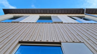 Julkisivujen ikkunoiden tuuletusikkunoiden päälle on asennettu aurinkosuojasäleikköjä