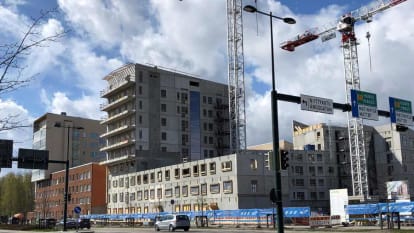 Kuva 4. Rakentamisessa tarvittavat isommat tavarat nostetaan sisälle ennen seuraavan kerroksen elementtiasennusta.