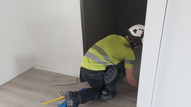 Kylpyhuoneiden laattapohjatyöt valmistuivat tänään ja vedeneristystyöt on tehty 1 - 3 kerroksissa. Laatoitustyöt ovat käynnissä kolmannessa kerroksessa. Maalaustyöt ovat valmiit kaikissa asunnoissa. Asuntojen laminaatit on asennettu toisessa ja kolmannessa kerroksessa sekä puolet neljännestä kerroksesta. Ensi viikolla alkavat väliovien asennukset. Porrashuoneen kaiteet on asennettu.