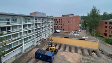 Korjauskierrokset ja pölyttömyyssiivoukset jatkuneet. Asuntojen viimeistelytyöt alkoivat tällä viikolla. Ensimmäisen kerroksen porrashuoneen mattoasennus valmistui ja talo B:n käytävämatot on valmiit kokonaisuudessaan. Porrashuoneiden maalaustyöt jatkuneet. Väestönsuojan verkkokomeroiden asennustyöt on käynnissä. Piha-alueen pyörätelineasennukset on valmiit. Parveketrallien asennukset on jatkuneet ja noin puolet on valmiit. Parvekkeiden vedenpoistojärjestelmän asennustyöt on valmiit.