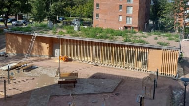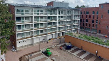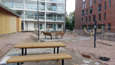 Pihatyöt ovat edenneet vauhdilla ja pihan asfalttipohjien teko on ollut tällä viikolla käynnissä. Kuntoiluvälineet ja kalusteet ovat löytäneet myös paikkansa pihalta. Piharakennus on valmistunut ja sen viherkatto on alkanut hienosti vihertämään. Sähköautojen latauspisteiden ja loppujen ulkovalaisimien asennus on käynnissä.
