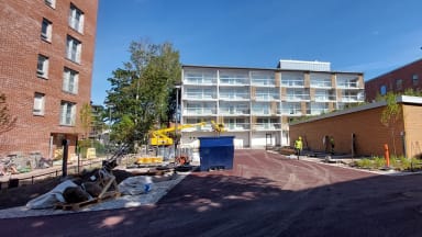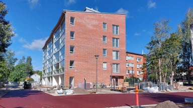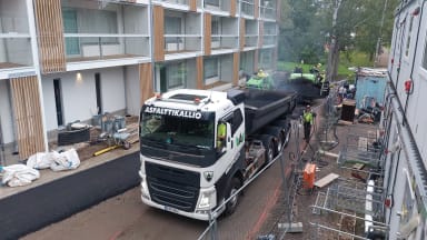 Pihalla tällä viikolla asfaltoitiin ja istutettiin puita sekä pensaita. Piha alkaa saamaan punaisen asfaltin myötä lopullisen värinsä. Julkisivusäleikköjen asennukset jatkuivat tällä viikolla A- ja B-taloissa, säleikköjen rimojen kiinnitys saadaan tehtyä kätevästi uudessa näyttävässä piharakennuksen polkupyörävarastossa.