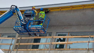 Sisällä jatkuvat tasoite- ja maalaustyöt. Hissiasennustyöt on käynnissä ja talotekniikkatyöt etenevät muiden rakennustöiden ohella. Julkisivun muuraustyöt ovat loppusuoralla.