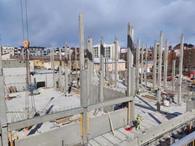Taidelukio Lumitin työmaalla runkotyöt ovat edenneet suunnitellusti eteenpäin. Rungon paikallavalutöitä on jatkettu 1. kerroksessa ja D-osan K. kerroksen holvin onteloiden saumavalut valetaan perjantaina. Elementtiasennukset ovat jatkuneet 1.kerroksessa ja lukion liikuntasali on alkanut hahmottumaan 1. kerrokseen, kun seinäelementit ovat asennettu liikuntasalin osalle paikalleen. C-lohkolle asennettiin viime viikolla rakennuksen viimeiset alapohjaontelolaatat. Tällä viikolla uutena työvaiheena alkoi väliseinämuuraukset K. kerroksessa.