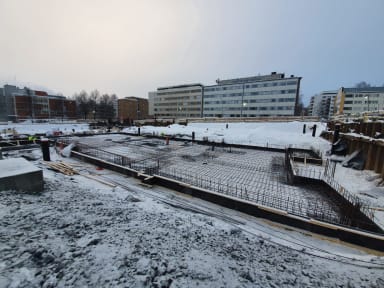 Taidelukion työmaalla on tällä viikolla rakennettu raikkaassa pakkaskelissä, valutyöt jatkuvat heti ensi viikon alusta pakkasen laskettua. Tällä viikolla perustustyöt ovat jatkuneet D-osalla ja anturoita valettiin tällä osalla tiistaina. A-lohkolla on kuluvalla viikolla tehty paalulaatan muotti- ja raudoitustöitä. Paalulaatta valetaan ensi maanantaina.