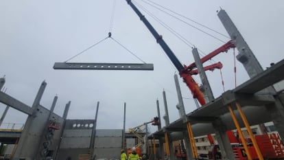 Taidelukio Lumitin työmaalla on tällä viikolla jatkettu töitä runkotöiden parissa. Tällä viikolla elementtiasennuksia on tehty 2.kerroksessa ja loppuviikosta asennettiin liikuntasalin kattorakenteiden elementtipalkit. Rungon paikallavalutyöt ovat loppusuoralla 1.kerroksen osalta ja tällä viikolla työmaalla valettiin tanssisalin korkea paikallavaluseinä, jolla on korkeutta 8 metriä.
