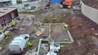 TOAS Rauhaniemen julkisivun telinepurkutyöt valmistuivat, ja ulkopuolella on jatkettu muita töitä. Kallion edustan tukimuuri asennettiin tällä viikolla ja maatöitä on jatkettu piharakennusten puolella. Työmaakopit siirrettiin vähän matkan päähän seuraavan rakennusprojektin tieltä. Parvekkeiden lasitus alkoi maanantaina ja etenee hyvää vauhtia.